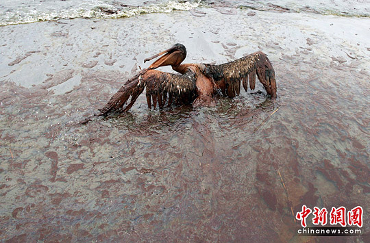 2010年6月3日,一只棕色鹈鹕浑身裹满石油,坐在路易斯安那沿岸East Grand Terre岛海滩。美国路易斯安那州East Grand Terre岛海滩,陷入浮油的海鸟。在英国石油公司工程师继续努力覆盖水下油流的同时,浮油侵袭海岸变得愈加频繁,结果越来越糟。