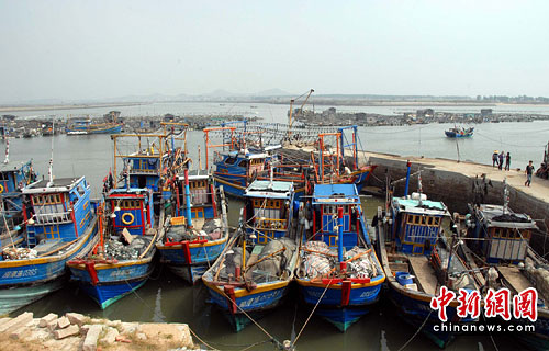 岱嵩村码头几十艘渔船整齐有序地排列在港区内。