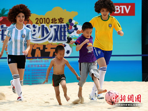 6月5日,第二届“海洋沙滩狂欢节”在北京朝阳公园奥运沙排场地亮相,让北京民众不出京城就能感受到海洋沙滩的快乐。为迎接世界杯的到来,本届沙滩节特设了2000多平米的足球乐园,可供游客躺在沙滩上观看南非世界杯的现场直播。沙滩节将持续至8月底。