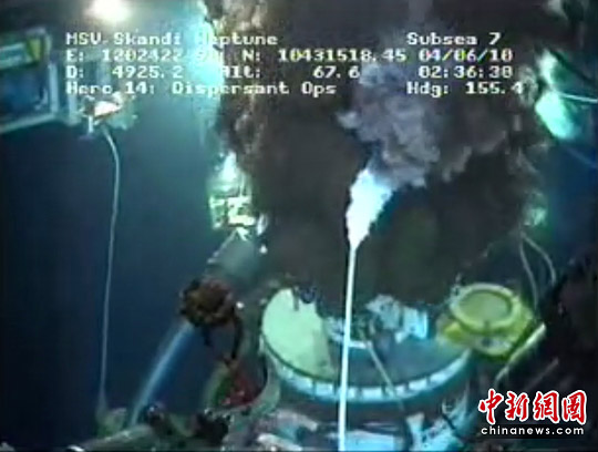 图为英石油公司正在为墨西哥湾漏油点“盖帽”。