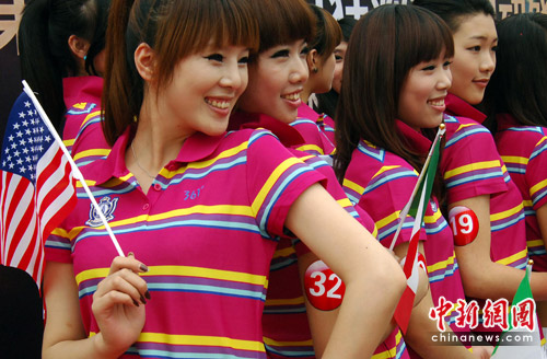 6月5日,来自台湾、福建等两岸各地的“足球宝贝世界杯”启动仪式在福州举行,两岸足球宝贝手里拿着自己喜观的各国国家队国旗,为其加油。中新社发 张丽君 摄
