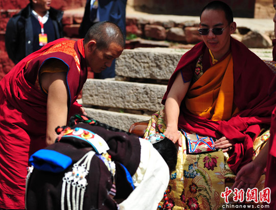 图为十一世班禅在热振寺给前来参加朝拜的信教群众摸顶。中新社发 旦增西旦 摄