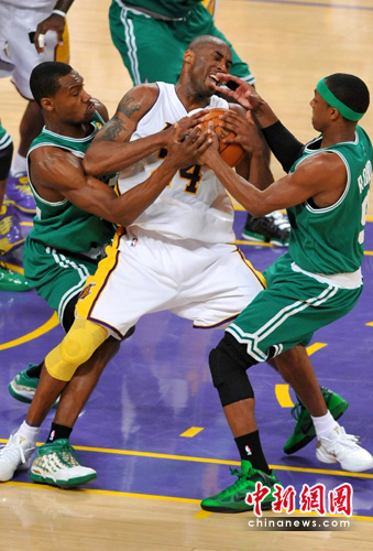 当地时间6月6日晚,2009-2010赛季总决赛第二场比赛在洛杉矶举行。“绿衫军”波士顿凯尔特人队在客场以103比94战胜洛杉矶湖人队,总比分扳成1比1。科比·布莱恩特遭遇严防死守,全场只得21分。中新社发 张炜 摄
