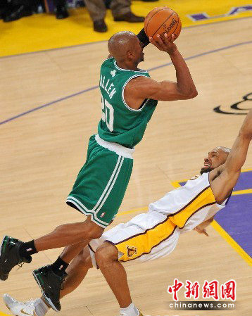 当地时间6月6日晚,2009-2010赛季总决赛第二场比赛在洛杉矶举行。“绿衫军”波士顿凯尔特人队在客场以103比94战胜洛杉矶湖人队,总比分扳成1比1。中新社发 张炜 摄