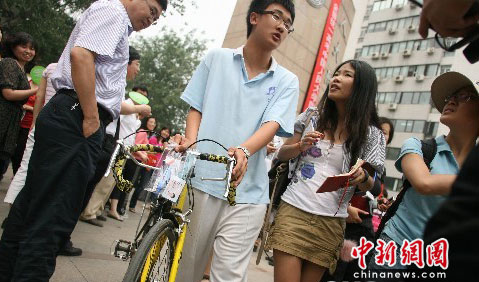 6月7日中午,全国高考第一场科目结束。一考生走出考场,立即被等待在外的家长和媒体记者围上前去。今天,所有的考生都是明星。中新社发 苏丹 摄