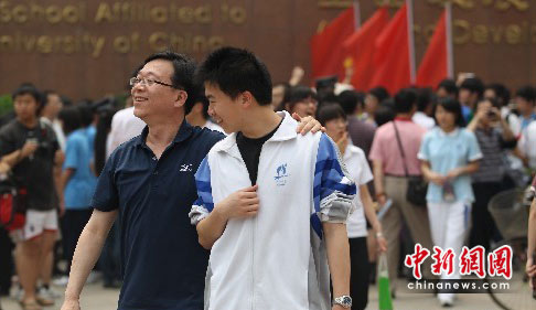 6月7日中午,全国高考第一场科目结束。北京一考点外,一父亲接到刚走出考场的孩子后,放松了放紧绷的面孔,喜笑颜开。中新社发 苏丹 摄