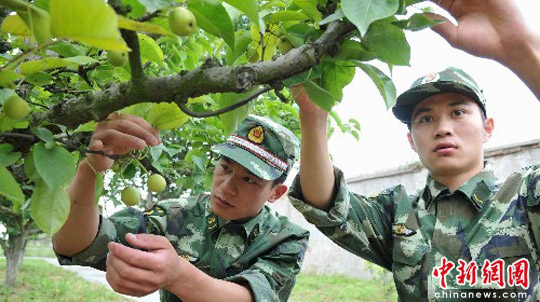 位于浙江省杭州市下沙元成村的武警浙江边防农场里,有一群穿着军装的“农民:,如同上演现实生活版的“开心农场”。图为农场官兵为梨树疏果。中新社发 郏策 摄