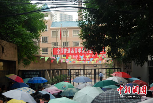 兰州市文科考点之一兰州市外国语学校的门口,一张张雨伞下面,深藏着每一位家长的心愿。杜刚 摄