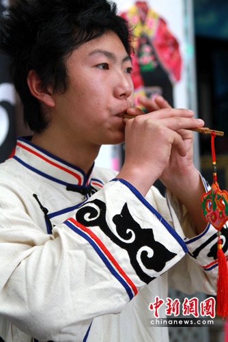 6月以来,上海世博园宝钢大舞台传承区的羌族文化表演引人关注。图为羌笛表演。中新社记者 殷春永 发