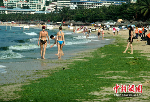 6月8日,游客在海南三亚铺了一层“绿地毯”的海滩上游玩。连日来,三亚大东海的沙滩上出现了大量的绿色海藻。据三亚环境监测站专家介绍,这种现象在2004年曾出现过,是一种海洋生态现象,它将随着海洋水文、气象及藻类生存的生态环境的变化而消失,对海洋环境与人类活动不会造成负面影响。中新社发 尹海明 摄