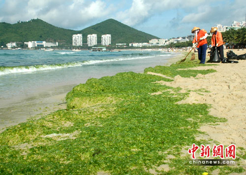 组图:三亚海滩遭绿藻“袭击”(2)