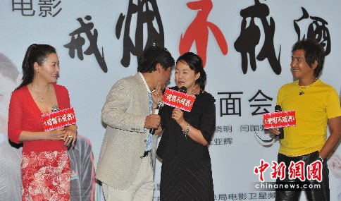 6月8日下午,由朱时茂自导自演的电影《戒烟不戒酒》在北京举行发布会。朱时茂和众美女现场大玩暧昧,与王思懿上演“惊天一吻”。中新社发 李学仕 摄