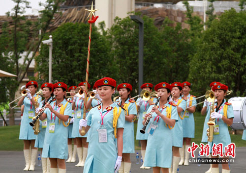 6月8日,上海世博会黑龙江活动周开幕式举行,该省漠河县北极光女子管乐团列队表演欢迎中外宾客。中新社记者 殷春永摄