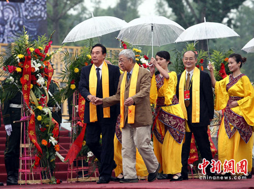 6月8日,2010年世界华人炎帝故里寻根节在湖北省随州市举行。社会各界2万多名嘉宾齐聚随州烈山,共同拜谒中华民族的始祖炎帝神农,祈福华夏繁荣昌盛。图为陈云林等嘉宾冒雨向炎帝神农敬献花篮。中新社发 鄂分 摄