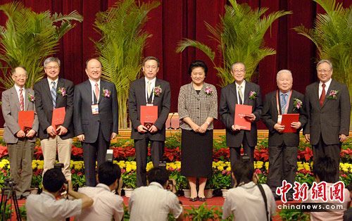 2010陈嘉庚科学奖6月9日在北京揭晓,力学家白以龙院士、物理化学家杨学明研究员、生物学家裴钢院士、石油地质学家李德生院士、城市规划建筑学家吴良镛院士(左至右),分别获本年度陈嘉庚数理科学奖、化学科学奖、生命科学奖、地球科学奖和技术科学奖,每人奖金30万元人民币。中国国务委员刘延东(中)出席颁奖仪式,并与中科院院长路甬祥(右一)、中国工程院院长徐匡迪(左三)共同为5位获奖科学家颁发奖章和证书。中新社发 徐曦弋 摄