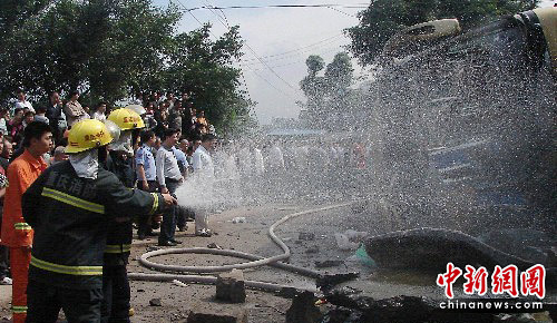 图为当地消防正用水枪为客车降温。中新社发 刘国平 摄