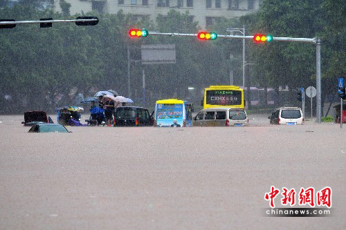 6月9日,广西重点防洪城市梧州遭遇了四年来最严重的一次内涝,导致梧州新兴二路两广市场加油站附近路段交通全部瘫痪。在两广市场附近,多辆汽车被困于水中。为解救被困在车上的市民,梧州市武警支队出动1艘冲锋舟,成功救出14位市民。中新社发 蒋雪林 摄