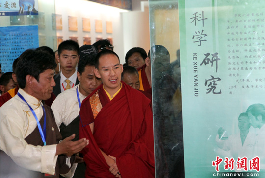 中国佛教协会副会长第十一世班禅额尔德尼·确吉杰布9日上午来到西藏藏医学院,受到学院师生热烈欢迎。十一世班禅一行在学院负责人引领下,步入学术报告厅,参观西藏藏医事业发展情况和学院建设。中新社发 徐长安 摄