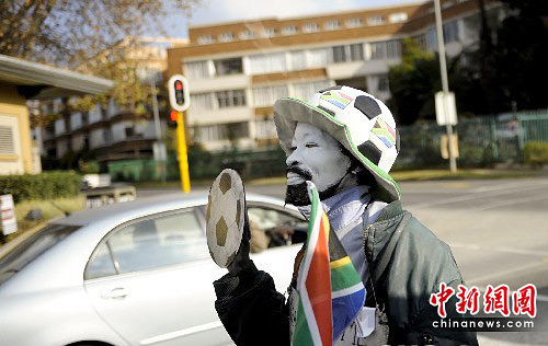 当地时间6月10日,南非约翰内斯堡街头的足球小丑吸引过往行人目光。中新社发 廖攀 摄