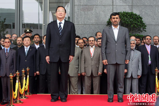 6月11日,伊朗总统艾哈迈迪·内贾德在上海世博园出席伊朗国家馆日活动。图为内贾德与中共上海市委书记俞正声(左)出席伊朗国家馆日升旗仪式。中新社发 汤彦俊 摄