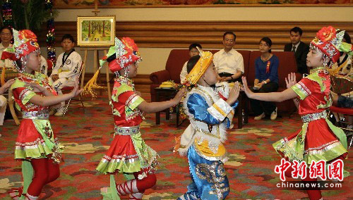 6月11日下午,中国国务院总理温家宝邀请参加“中韩青少年友好交流团”的中韩青少年到北京中南海作客。图为来自四川特大地震灾区的儿童表演羌族舞蹈。中新社发 任晨鸣 摄