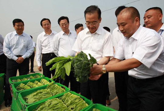6月10日,温家宝在许昌县将官池镇天和万亩有机蔬菜示范基地了解蔬菜生产与价格情况。庞兴雷摄