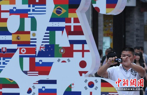 一名市民在北京王府井步行街上为迎接南非世界杯摆放的宣传造型边拍照留念。中新社发 侯宇 摄