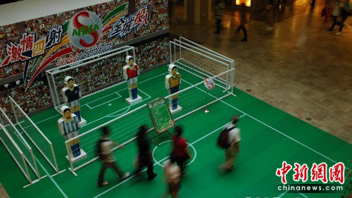 市民从布置成足球场造型的北京某商场大厅走过。中新社发 侯宇 摄