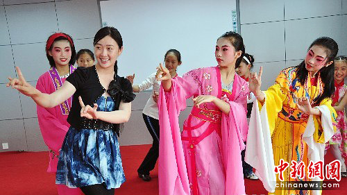 图为福建莆仙戏演员黄艳艳正向小学学生传授莆仙戏基本动作“双指手”。中新社发 林剑冰 摄