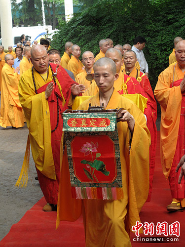 中新网南京6月12日电(申冉)今天清晨7点半钟,南京市博物馆所在地——南京朝天宫正殿前,迎接七宝阿育王宝塔内的金棺银椁迎请法会正式开始,法会仪式由南京市栖霞寺主持、南京市佛教协会副会长隆相法师主持,近两百名佛教教徒在殿前为金棺银椁念经诵祷。