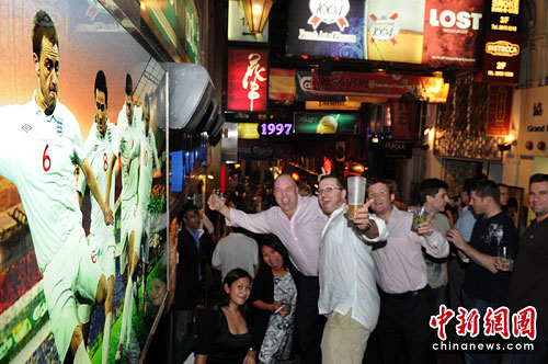 6月11日晚,随着各国足球运动员在南非披甲上阵争夺“世界杯”,球迷们在被誉为“制造欢乐的地方”——兰桂坊也开始彻夜狂欢。中新社发 郑祚声 摄