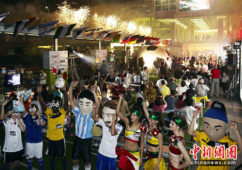 6月11日晚,2010世界杯足球赛揭幕,香港海港城举行派对,与全城球迷一起欣赏世界杯的揭幕礼及揭幕赛。中新社发 洪少葵 摄