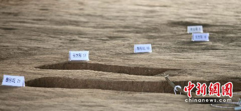 6月12日,安阳曹操高陵发掘发掘出的9对磬形坑与一个神秘的方形坑,考古工作者选择二号墓道两边的磬形坑和长方形坑进行了考古发掘,在长方形坑中发现有分布规律的铁钉。中新社发 王中举 摄