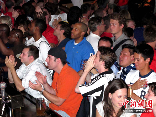 12日下午,在纽约时报广场边上的“ESPN俱乐部”,球迷们早已占据了这座四层楼的体育主体酒吧,里面的球迷有的身披英格兰战袍,有的穿着美国队球衣,各自占据地盘,观看美英之战,并为各自队伍喝彩。中新社发 孙宇挺 摄