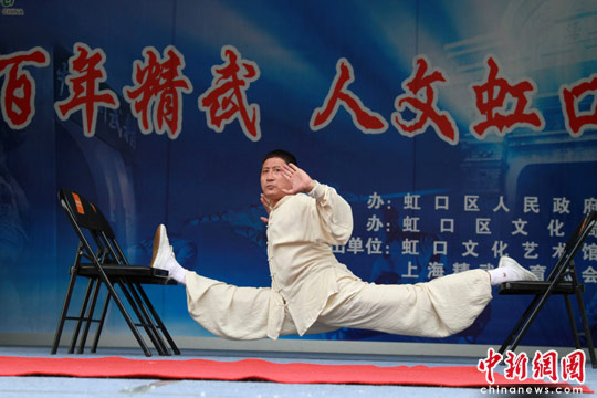 上海世博会社区市民活动——虹口区专场于6月10日-19日在世博园区市民广场上演。上海精武体育总会张世刚先生表演的“童子功”,引得观者连连称赞。殷春永 摄