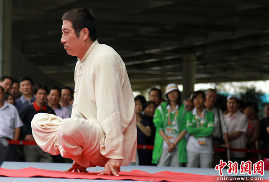上海世博会社区市民活动——虹口区专场于6月10日-19日在世博园区市民广场上演。上海精武体育总会张世刚先生表演的“童子功”,引得观者连连称赞。殷春永 摄
