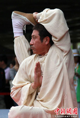 上海世博会社区市民活动——虹口区专场于6月10日-19日在世博园区市民广场上演。上海精武体育总会张世刚先生表演的“童子功”,引得观者连连称赞。殷春永 摄