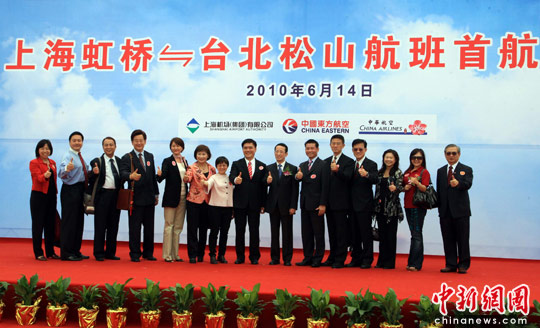 6月14日,台北市长郝龙斌搭乘台北松山——上海虹桥首航飞机抵达上海。图为郝龙斌等在上海虹桥机场为台北松山——上海虹桥直航剪彩。中新社发 潘索菲 摄