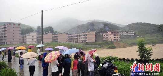 6月14日,南平市中南部普降暴雨,其中延平区降特大暴雨。当日12时30分许,在县道延塔线11公里处突发山体滑坡,将途经该路段的1部中巴车和1部面包车(车内司乘人员共31人)推入水流湍急的西塔溪中,其中7人获救,24人失踪。图为案发现场西芹镇福建农林大学附近闽江边,大家正焦急的等待搜救中。中新社发 柳涛 摄