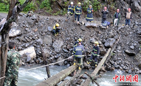 图为救援消防官兵正在抢通便桥。中新社发 肖波 摄