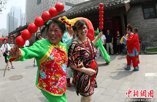 6月15日,来自苏格兰的女孩VICKY在北京南新仓与社区居民一起包粽子、跑旱船、扭秧歌,欢度端午佳节。中新社发 杜洋 摄