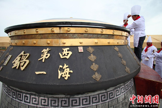 6月15日,新疆博湖博斯腾湖举办第三届捕鱼节暨祭湖仪式邀天下宾朋品鱼,本届捕鱼节最大的亮点当属西海第一锅之西海鱼宴和西海第一锅之端午粽子宴。西海第一锅构思独特、设计巧妙、外观精美,锅直径达3.9米,寓意博湖县建县39周年。中新社发 马卫平 摄
