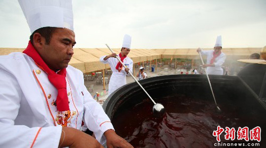 6月15日,新疆博湖博斯腾湖举办第三届捕鱼节暨祭湖仪式邀天下宾朋品鱼,本届捕鱼节最大的亮点当属西海第一锅之西海鱼宴和西海第一锅之端午粽子宴。西海第一锅构思独特、设计巧妙、外观精美,锅直径达3.9米,寓意博湖县建县39周年。中新社发 马卫平 摄