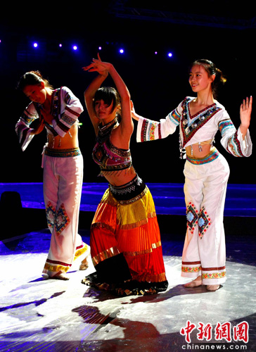 将于6月16日中国传统端午节晚,在台北县新庄体育馆举办的“客家之歌”大型电视综艺晚会,6月15日演出现场在紧锣密鼓的彩排。中新社记者 宋吉河 摄