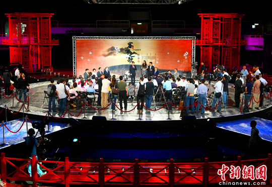 将于6月16日中国传统端午节晚,在台北县新庄体育馆举办的“客家之歌”大型电视综艺晚会,6月15日演出现场在紧锣密鼓的彩排。中新社记者 宋吉河 摄