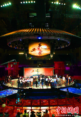 将于6月16日中国传统端午节晚,在台北县新庄体育馆举办的“客家之歌”大型电视综艺晚会,6月15日演出现场在紧锣密鼓的彩排。中新社记者 宋吉河 摄
