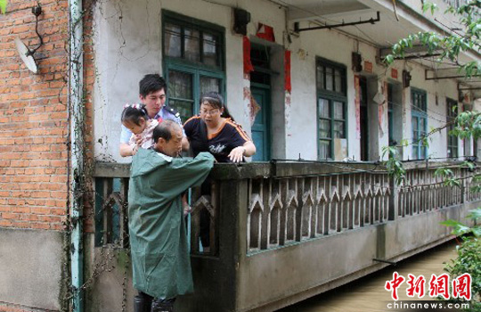 6月15日13时31分许,位于永安解放北路1275号低凹处,群众被洪水围困。中新社发 陈玉帆 摄