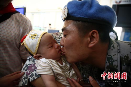 6月16日,中国第7批赴黎巴嫩维和部队从成都双流国际机场出发,该队由成都军区总医院医疗分队和成都军区某集团军工兵分队组成,共计335名,他们将与第六批赴黎巴嫩中国维和工兵营官兵进行轮换并执行为期8个月的维和任务。图为出发前一官兵与其子吻别。中新社发 张浪 摄