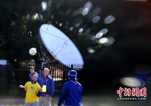6月16日,南非比勒陀利亚洛夫托斯球场外的卫星天线前,工作人员欢快地玩起足球。中新社发 廖攀 摄