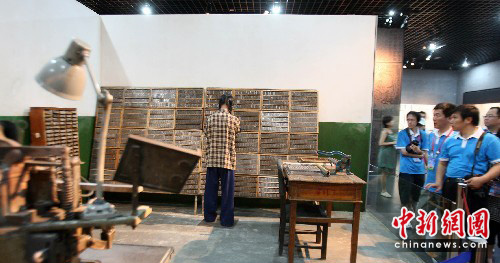 中国文字博物馆“活字印刷”展区,上世纪中期的老式印刷设备和栩栩如生的女打字员蜡像夺人眼球。中新社发 王中举 摄